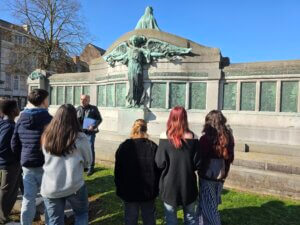 Et c’est peut-être là toute la force de cette balade : transformer le décor familier du quotidien en terrain de mémoire. « Parfois, on se balade en ville pendant des années sans remarquer ce qui nous entoure et qui évoque pourtant cette période », confie Jean-Yves. « Nous allons d’ailleurs passer devant une façade où l’on peut encore voir des impacts de bombes. » Pour Théo, l’un des élèves du groupe, la révélation est immédiate : « Je ne me doutais pas qu’il y avait autant de traces de la guerre dans la ville. » Son ami Logan complète sa pensée : « C’est chouette ce genre d’activité — ça change du cours d’histoire où l’on reste assis en classe. Ici, on se rend vraiment mieux compte de ce qu’il s’est passé. »
