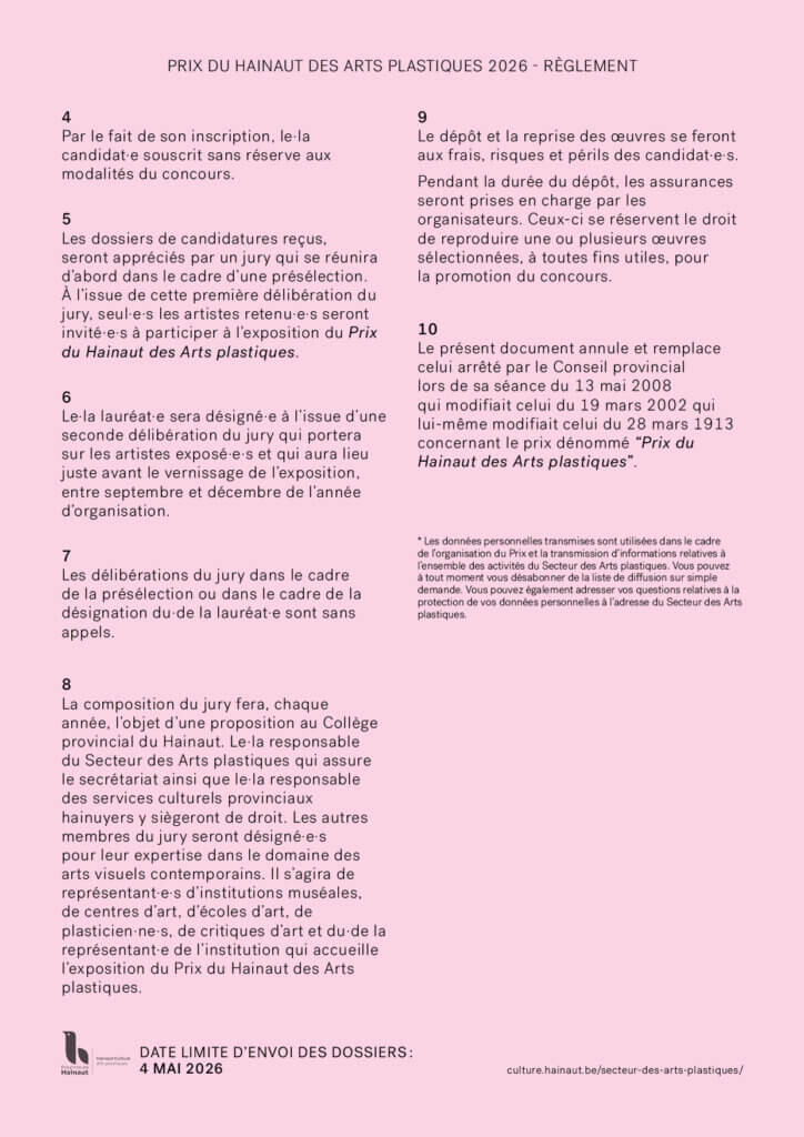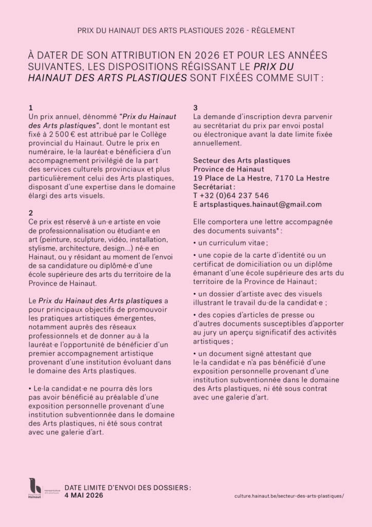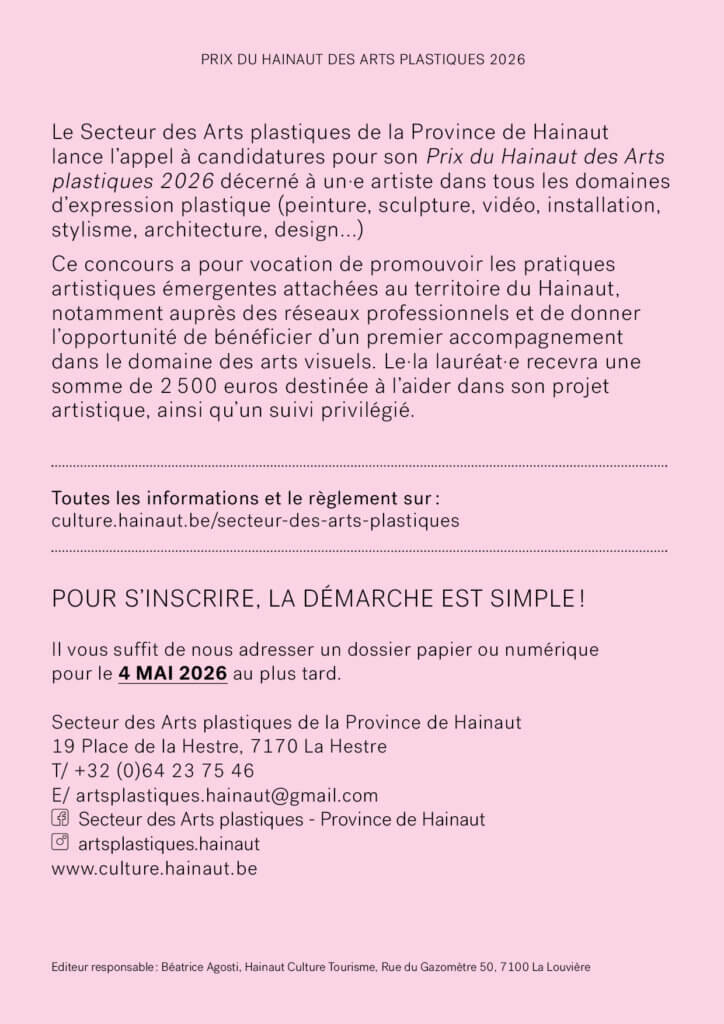 Notre Secteur des Arts plastiques lance l’appel à candidatures pour pour son Prix du Hainaut des Arts plastiques 2026 décerné à un.e artiste dans tous les domaines d’expression plastique (peinture, sculpture, vidéo, installation, stylisme, architecture, design…).