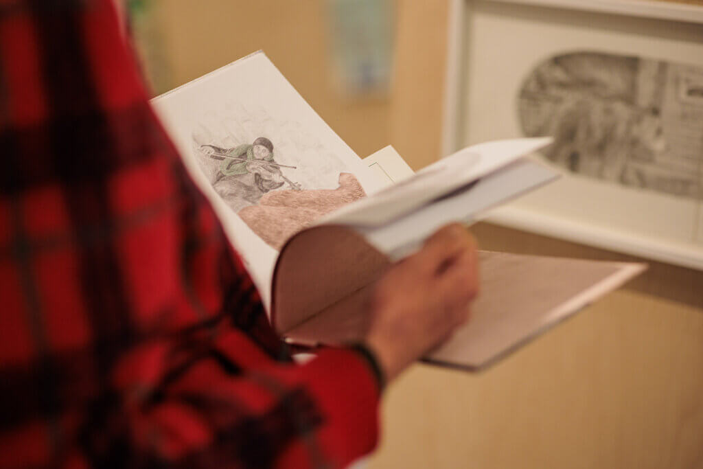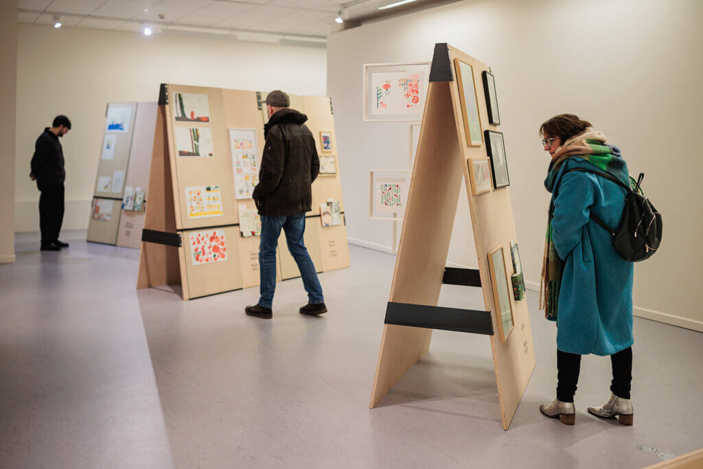 Le Centre de la Gravure a choisi non seulement de reprendre ce projet, mais aussi de l’agrandir, en y intégrant plusieurs estampes issues de sa propre collection. Le dialogue entre livres, dessins originaux et œuvres imprimées se déploie dans une scénographie singulière : ici, rien n’est accroché aux murs. Les œuvres se dévoilent sur des cimaises en forme de tipis, chaque face offrant une immersion dans l’univers d’un artiste. Une invitation à circuler, à s’arrêter, à regarder autrement.