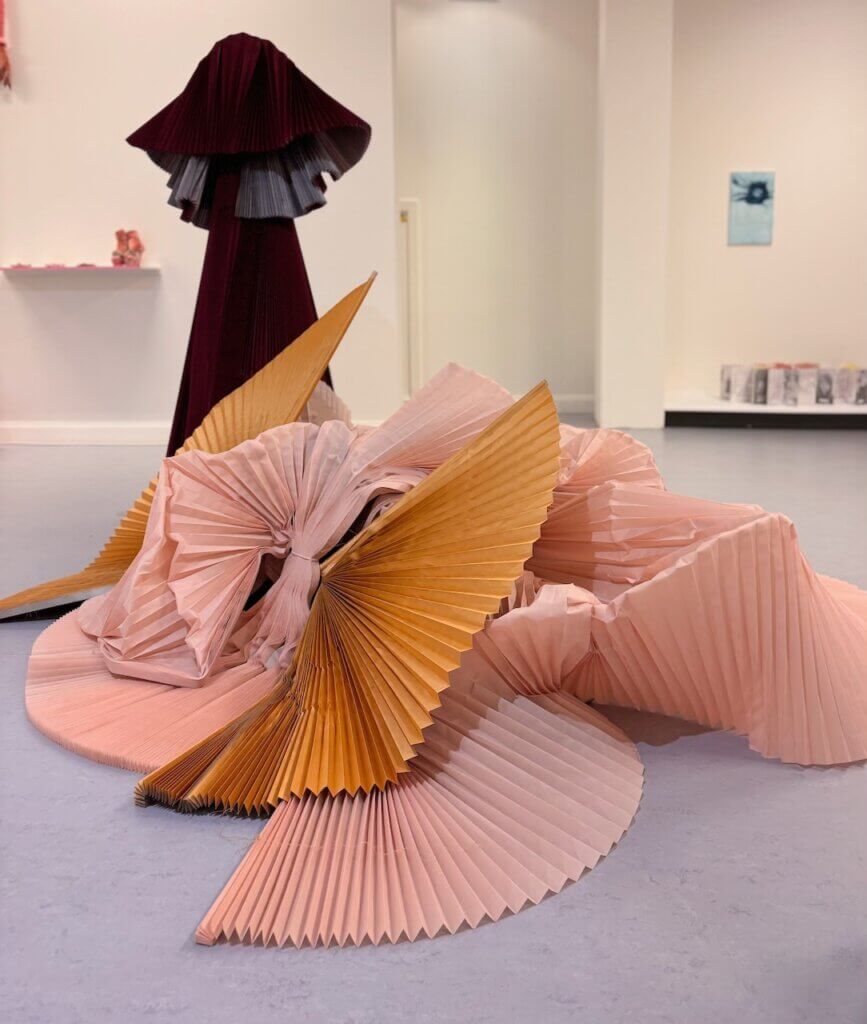 Chez Sarah Bonami, les tissus se font abris occultant ou dés-occultant les formes des corps qu’ils recouvrent. C’est le mouvement qui transforme ces drapés en lieux sécurisant pour la peau. La danse, qui met en action ses sculptures, prend une place importante dans le travail de la jeune artiste. Elle insuffle liberté et respiration et donne au vêtement un rôle de protection. Plus loin dans l’espace d’exposition, une fois immobiles, ces sculptures évoquent les éléments de la flore et invitent à la balade, à la rêverie. Le paysage à traverser propose alors un environnement dans les salles. Des éléments d’une nature sortis de terre que la plasticienne propose de contempler comme on observe son jardin intérieur.