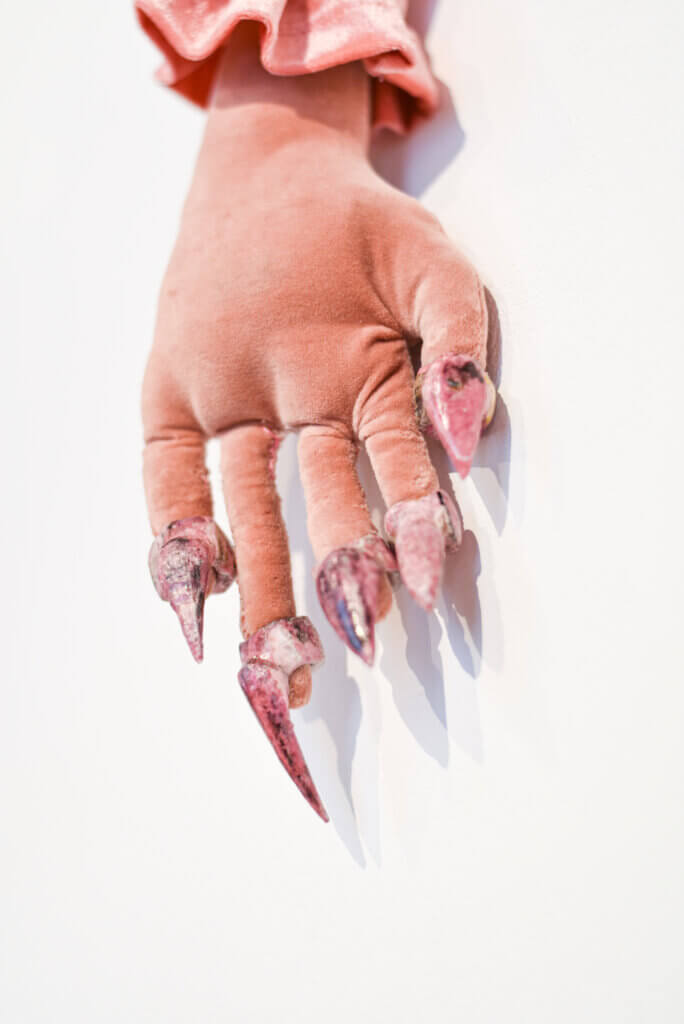 Fanny Alet, Sage, ongles en papier mâché trempé dans la cire, bras cousus en velours rembourré de ouatine, 100 x 10 cm, 2025 ©Chloé Jacquart