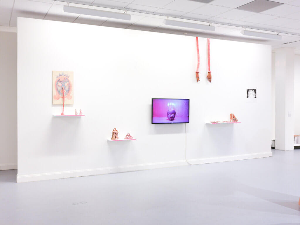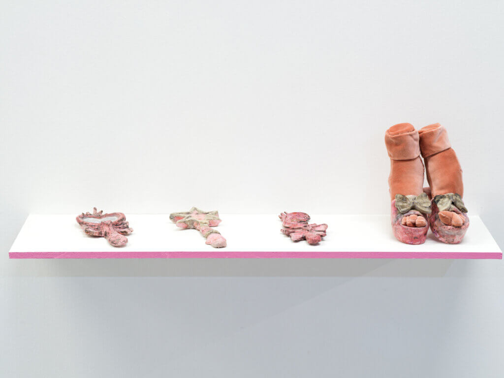 Il n’est pas étonnant qu’une baguette magique ait trouvé place dans le kit de beauté pour petite fille créé par l’artiste Fanny Alet tant ses objets ont le pouvoir de nous transporter dans l’intimité rose poudré d’une chambre d’enfant. Dans ce refuge, on rêvait d’histoires de princesses et on se berçait d’illusions. Mais très vite, à la vue de ces objets, le miroir aux alouettes se fissure, une tension se révèle. La surface lisse de ces artefacts façonnés en papier mâché, trempés dans la cire et poncés suggère tantôt la douceur fragile du temps passé tantôt la gravité froide de la pierre tels des ex-voto d’un imaginaire genré. Avec cette installation faussement ingénue, Fanny Alet questionne, décale et permet à celui qui le désire de proposer une nouvelle narration aux symboles féminins.