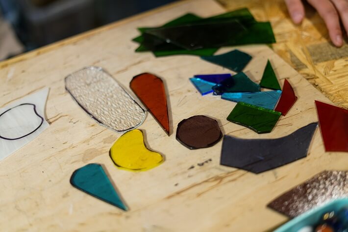 L’approche consistera en un apprentissage de la découpe du verre (tracer, couper, meuler, …), du cerclage des pièces de verre par un ruban de cuivre autocollant et de l’assemblage au moyen de soudure à l’étain.